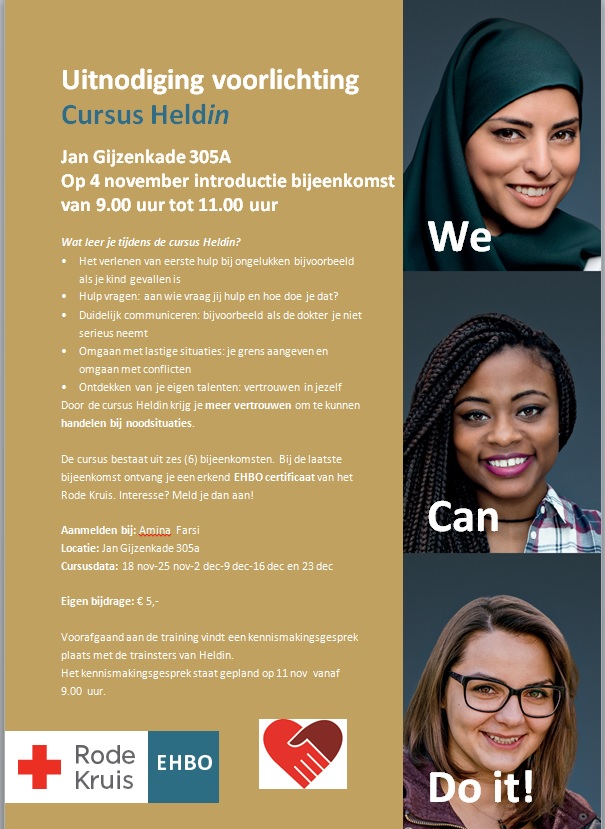Voor alle vrouwen die met succes hebben deelgenomen aan de cursus “Heldin” was 16 december was de laatse les. De officiele afsluiting en diploma uitreiking is afgelast als gevolg van de corona maatregelen. Dat wordt later nog een keer ingehaald. Deze cursus is gegeven in samenwerking met het Rode Kruis.